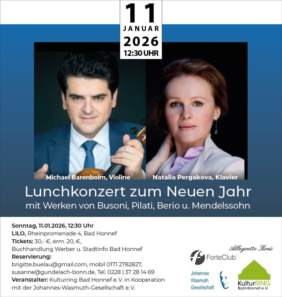 Die erste Hälfte des Jahres 2026 steht wieder in Zeichen von Ausnahmeviolinisten. Den Beginn macht Michael Barenboim, 1. Konzertmeister des West Eastern Divan Orchestras und Professor an der Barenboim-Said-Akademie Berlin. Engagements führten in u.a. in die Carnegie Hall, ins das Teatro Colon in Buenos Aires, er spielte mit den Wiener Philharmonikern, dem Chicago Symphony Orchestra, den Münchner Philharmonikern u.v.a. Für seinen Einsatz für eine friedliche Lösung des Nahostkonflliktes wurde er zum Ehrenmitglied der Johannes-Wasmuth-Gesellschaft e.V. ernannt. Die preisgekrönte Pianistin Natalia Pegarkova-Barenboim ist eine hervorragende Klaviersolistin und Kammermusikerin. Sie trat u.a. mit der Münchner Philharmonikern, der Jungen Deutsche Philharmonie und dem Berlin Chamber Orchestra auf und ist international bei Festivals tätig.