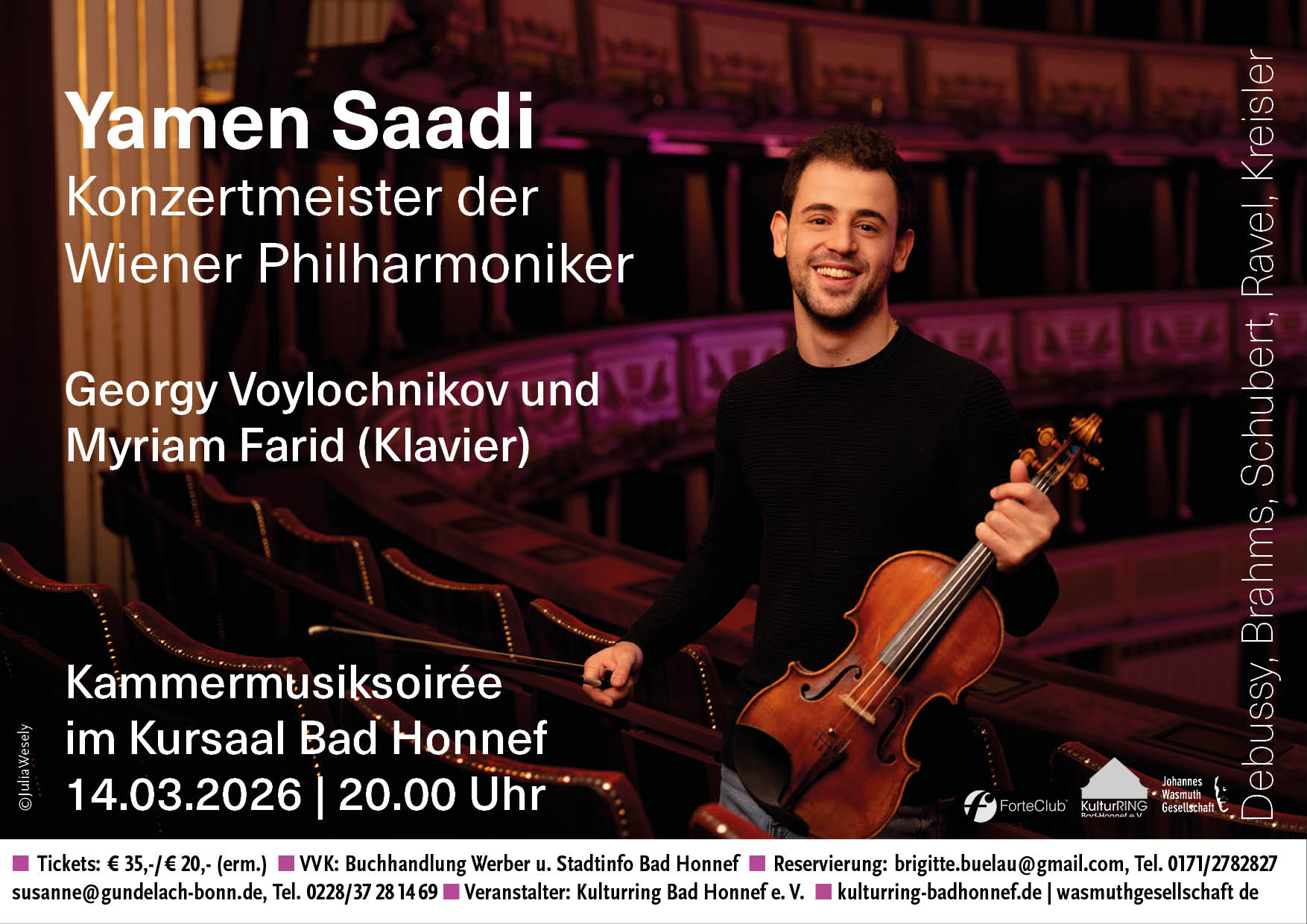 Samstag, 14. März 2026, 20:00 Uhr Musik von Brahms, Ravel und Kreisler im Kursaal Bad Honnef